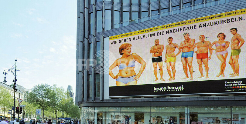 【5月1日 AFP】ドイツ・ベルリン(Berlin)の目抜き通りクーダム(Ku'damm)に4月30日、紫色の下着姿のアンゲラ・メルケル(Angela Merkel)首相を描いた100平方メートルの超巨大広告が登場し、道行く人の度肝を抜いた。