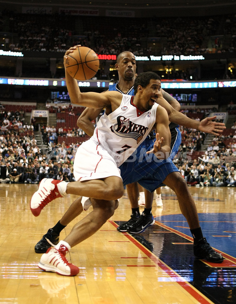 08-09NBA東カンファレンスプレーオフ1回戦、フィラデルフィア・セブンティシクサーズ(%%Philadelphia 76ers%%)対オーランド・マジック(%%Orlando Magic%%)第6戦。試合はマジックがドワイト・ハワード(%%Dwight Howard%%)を出場停止で欠きながらも114-89で勝利し、対戦成績を4勝2敗として準決勝進出を決めた。写真はラファー・アルストン(%%Rafer Alston%%)にドライブを仕掛けるセブンティシクサーズのアンドレ・イグドーラ(%%Andre Iguodala%%、手前)。(2009年4月30日撮影)(c)AFP/Getty Images/Nick Laham