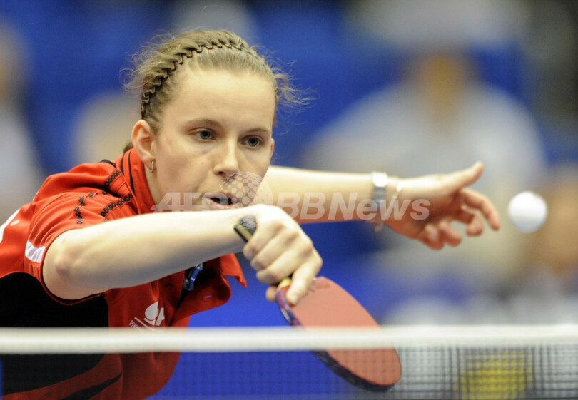 09世界卓球選手権横浜大会(%%2009 World Table Tennis Championships in Yokohama%%)女子シングルス準々決勝。中国の劉詩ウェン(%%Liu Shiwen%%)は、チェコのイベタ・バチェノフスカ(%%Iveta Vacenovska%%)と対戦。劉詩ウェンは4-1(9-11、11-8、12-10、11-5、17-15)で勝利し、準決勝に進出した。写真はボールを打ち返すイベタ・バチェノフスカ。(2009年5月3日撮影)(c)AFP/Kazuhiro NOGI