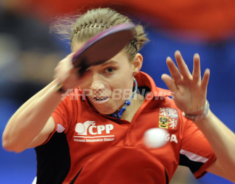 09世界卓球選手権横浜大会(%%2009 World Table Tennis Championships in Yokohama%%)女子シングルス準々決勝。中国の劉詩ウェン(%%Liu Shiwen%%)は、チェコのイベタ・バチェノフスカ(%%Iveta Vacenovska%%)と対戦。劉詩ウェンは4-1(9-11、11-8、12-10、11-5、17-15)で勝利し、準決勝に進出した。写真はボールを打ち返すイベタ・バチェノフスカ。(2009年5月3日撮影)(c)AFP/Kazuhiro NOGI
