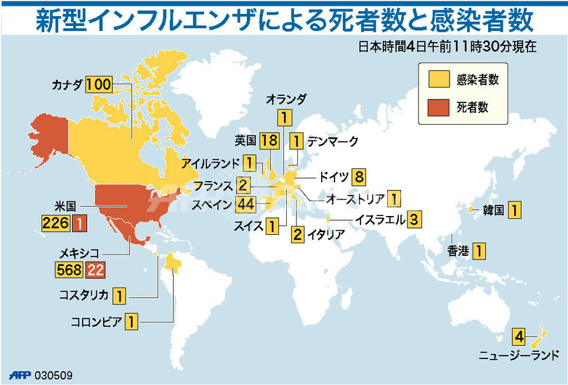 ニュース ライフ 図解 【図解】新型インフルエンザによる死者数と感染者数 2009年5月4日 12:34 発信地:宇宙 [ 例外 宇宙 ] このニュースをシェア (c)AFP 【5月4日 AFP】図は、日本時間4日午前11時30分現在の、各国の新型インフルエンザによる死者数と感染者数の状況を示したもの。(c)AFP<ニュース解説画像一覧へ>【参考】厚生労働省のホームページ ライフ 一覧へ> メディア・報道関係・法人の方向け 写真・動画 購入のお問合せ>