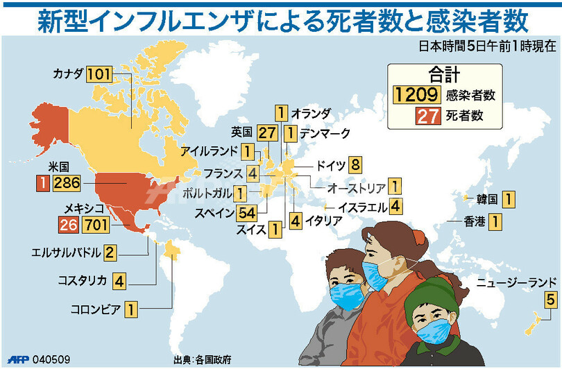 ニュース ライフ 図解 【図解】新型インフルエンザによる死者数と感染者数 2009年5月5日 9:49 発信地:その他 [ 例外 その他 ] このニュースをシェア (c)AFP 【5月5日 AFP】図は、日本時間5日午前1時現在の、各国の新型インフルエンザによる死者数と感染者数の状況を示したもの。(c)AFP<ニュース解説画像一覧へ>【参考】厚生労働省のホームページ ライフ 一覧へ> メディア・報道関係・法人の方向け 写真・動画 購入のお問合せ>