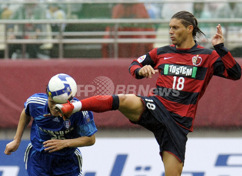 サッカーAFCチャンピオンズリーグ2009(%%AFC Champions League 2009%%)1次リーグG組、鹿島アントラーズ(%%Kashima Antlers%%)対水原三星ブルーウイングス(%%Suwon Samsung Bluewings%%)。試合は鹿島アントラーズが3-0で快勝して勝ち点を12に伸ばし、同組のもう1試合で上海申花(%%Shanghai Shenhua%%)がシンガポール・アームド・フォーシズFC(%%Singapore Armed Forces FC%%)と1-1で引き分けたため、決勝トーナメント進出を果たした。写真は水原三星の崔成煥(%%Choi Sung-Hwan%%、左)とボールを競る鹿島のマルキーニョス(%%Marcos Gomes De Araujo 'Marquinhos'%%)。(2009年5月5日撮影)(c)AFP/TOSHIFUMI KITAMURA