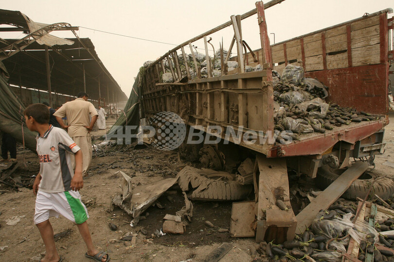 市場の関係者がAFPに語ったところによると、男が軽トラックを市場に駐車し、その場を去ったという。同市場は、バグダッド最大の共同卸売り市場で、野菜などを扱っている。