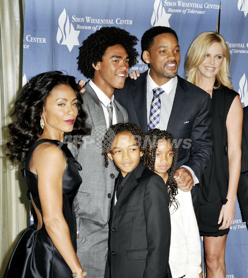 ユダヤ系人権擁護団体「サイモン・ウィーゼンタール・センター(Simon Wiesenthal Center)」が主催するパーティーが5日、米カリフォルニア(Beverly Hills)州ビバリーヒルズ(California)で開催され、ハリウッドスターらが出席した。写真は、会場に姿を見せた俳優ウィル・スミス(Will Smith)一家と女優シャーリーズ・セロン(Charlize Theron、右、2009年5月5日撮影)。(c)AFP/Getty Images/Kevin Winter
