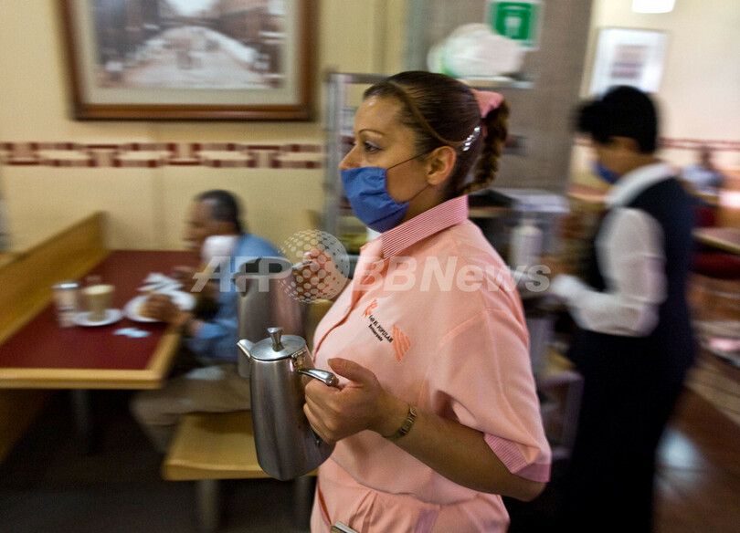 首都メキシコ市(Mexico City)の飲食店でマスクをして働く従業員。6日、新型インフルエンザ感染拡大の予防措置として閉鎖・休業していたメキシコの企業や飲食店が、5日ぶりに業務を再開した(2009年5月6日撮影)。(c)AFP/Ronaldo Schemidt