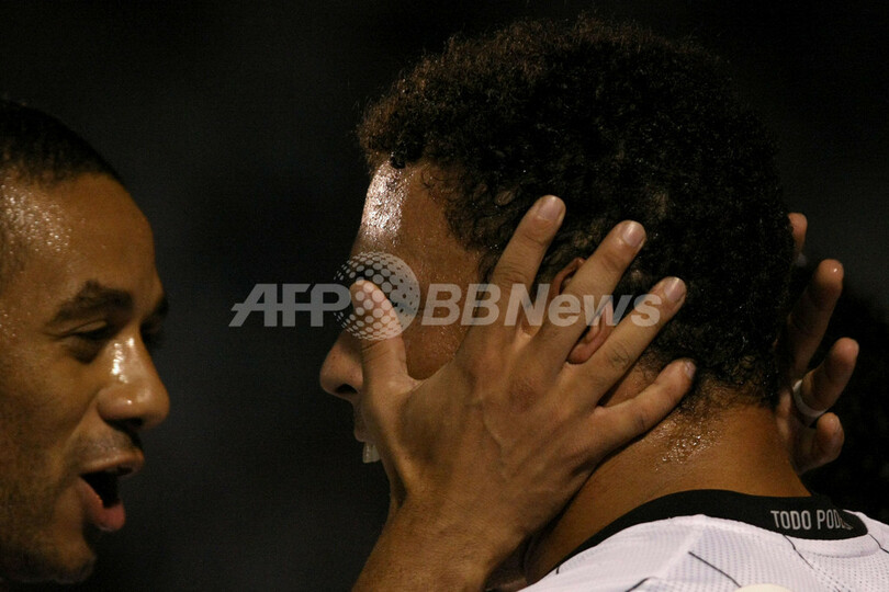 サッカーブラジル杯(%%Copa do Brasil 2009%%)3回戦、アトレチコ・パラナエンセ(%%Atletico Paranaense%%)対コリンチャンス(%%Corinthians%%)第2戦。試合はロナウド(%%Ronaldo%%)が2得点を記録してコリンチャンスが勝利し、2試合合計スコアを4-3として準々決勝に進んだ。写真はゴールを決めてクリスチャン(%%Cristian Mark Junio Nascimento Oliveira%%)から祝福されるコリンチャンスのロナウド(右)。(2009年5月6日撮影)(c)AFP/MAURICIO LIMA