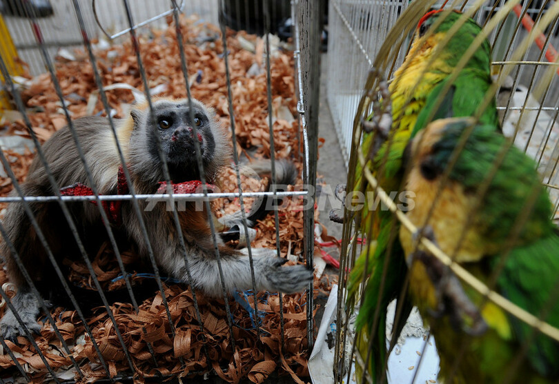 ニュース ライフ 違法に販売されていた野生動物を救出、コロンビア警察 2009年5月9日 12:18 発信地:ボゴタ/コロンビア [ 中南米 コロンビア ] このニュースをシェア ‹ › ❮ 2/4 ❯ コロンビアの首都ボゴタ(Bogota)の市場で違法に販売されていたところを警察に救出された小型のサルとインコ。コロンビアでは自宅で野生動物を飼うことは法律で禁じられている。(2009年5月7日撮影)。(c)AFP/Mauricio DUENAS 画像作成中 ! 【5月9日 AFP】コロンビアの首都ボゴタ(Bogota)の市場で、警察が野生動物の違法販売現場を取り締まった。コロンビアでは自宅で野生動物を飼うことは法律で禁じられている。(c)AFP ライフ 一覧へ> メディア・報道関係・法人の方向け 写真・動画 購入のお問合せ>