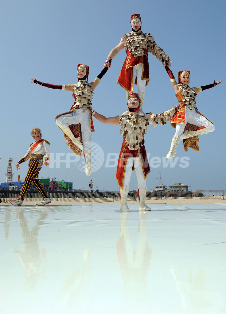 シルク・ドゥ・ソレイユ(Cirque du Soleil)が12日、米カリフォルニア(California)州サンタモニカ(Santa Monica)のサンタモニカ埠頭(Santa Monica Pier)で新プログラム「クーザ(Kooza)」を披露した。「クーザ」は10月からサンタモニカ埠頭の100周年祭とシルク・ドゥ・ソレイユの創設25周年記念を兼ねてサンタモニカで上演される。写真は、プレビューに登場した団員たち(2009年5月12日撮影)。(c)AFP/GABRIEL BOUYS