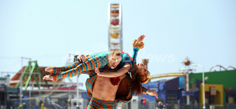 シルク・ドゥ・ソレイユ(Cirque du Soleil)が12日、米カリフォルニア(California)州サンタモニカ(Santa Monica)のサンタモニカ埠頭(Santa Monica Pier)で新プログラム「クーザ(Kooza)」を披露した。「クーザ」は10月からサンタモニカ埠頭の100周年祭とシルク・ドゥ・ソレイユの創設25周年記念を兼ねてサンタモニカで上演される。写真は、プレビューに登場した団員たち(2009年5月12日撮影)。(c)AFP/GABRIEL BOUYS