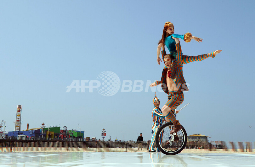 Kooza)」を披露した。「クーザ」は10月からサンタモニカ埠頭の100周年祭とシルク・ドゥ・ソレイユの創設25周年記念を兼ねてサンタモニカで上演される。(c)AFP