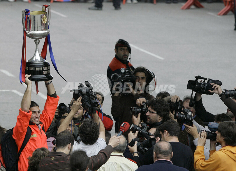 13日に行われたサッカースペイン国王杯(%%Copa del Rey 2008-09%%)決勝でアスレティック・ビルバオ(%%Athletic Bilbao%%)を4-1で下し、11シーズンぶり25度目の優勝を果たしたFCバルセロナ(%%FC Barcelona%%)が14日、本拠地カンプ・ノウ・スタジアム(Camp Nou stadium)に凱旋した。写真はトロフィーを掲げるFCバルセロナのGKホセ・ピント(%%Jose Pinto%%)。(2009年5月14日撮影)(c)AFP/JOSEP LAGO