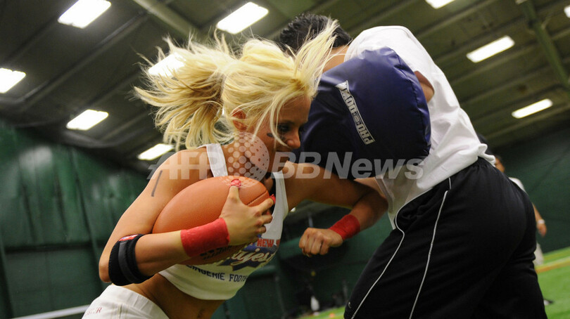 米国で、下着姿でアメリカンフットボールをする「ランジェリーフットボール(Lingerie Football)」の全米リーグが、今年9月に開幕する。「ランジェリーフットボールリーグ(Lingerie Football League、LFL)」は、全米10チームが20週のシーズンを戦う。14日、ニューヨーク(New York)市近郊のフリーポート(Freeport)で行われたニューヨーク・マジェスティ(New York Majesty)の入団テストには、24人の若い女性が参加し、露出度の高い運動着を着てフットボールの技能を競い合った。写真は、入団テストに参加した入団志望者(2009年5月14日撮影)。(c)AFP/Emmanuel Dunand