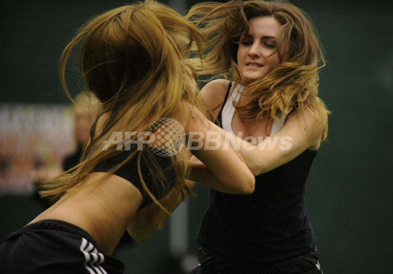 米国で、下着姿でアメリカンフットボールをする「ランジェリーフットボール(Lingerie Football)」の全米リーグが、今年9月に開幕する。「ランジェリーフットボールリーグ(Lingerie Football League、LFL)」は、全米10チームが20週のシーズンを戦う。14日、ニューヨーク(New York)市近郊のフリーポート(Freeport)で行われたニューヨーク・マジェスティ(New York Majesty)の入団テストには、24人の若い女性が参加し、露出度の高い運動着を着てフットボールの技能を競い合った。写真は、入団テストに参加した入団志望者ら(2009年5月14日撮影)。(c)AFP/Emmanuel Dunand