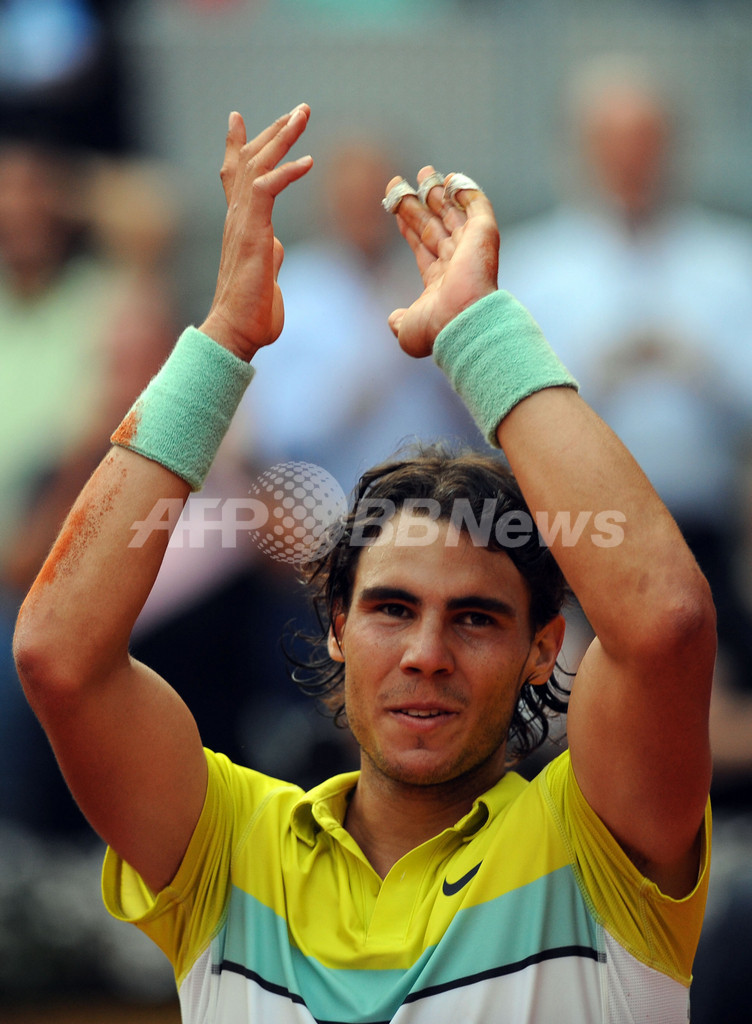 ムチュア・マドリレーニャ・マドリード・オープン(%%Mutua Madrilena Masters Madrid Open 2009%%)男子シングルス準決勝。大会第1シードのラファエル・ナダル(%%Rafael Nadal%%、スペイン)は、大会第3シードのノバク・ジョコビッチ(%%Novak Djokovic%%、セルビア)と対戦。ナダルは3-6、7-6、7-6でジョコビッチに勝利し、決勝進出を決めた。写真は試合に勝利し、歓声に応えるラファエル・ナダル。(2009年5月16日撮影)(c)AFP/JAVIER SORIANO