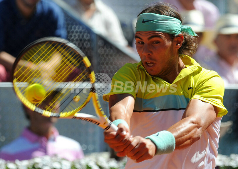 ムチュア・マドリレーニャ・マドリード・オープン(%%Mutua Madrilena Masters Madrid Open 2009%%)男子シングルス準決勝。大会第1シードのラファエル・ナダル(%%Rafael Nadal%%、スペイン)は、大会第3シードのノバク・ジョコビッチ(%%Novak Djokovic%%、セルビア)と対戦。ナダルは3-6、7-6、7-6でジョコビッチに勝利し、決勝進出を決めた。写真はリターンショットを打ち返すナダル。(2009年5月16日撮影)(c)AFP/JAVIER SORIANO
