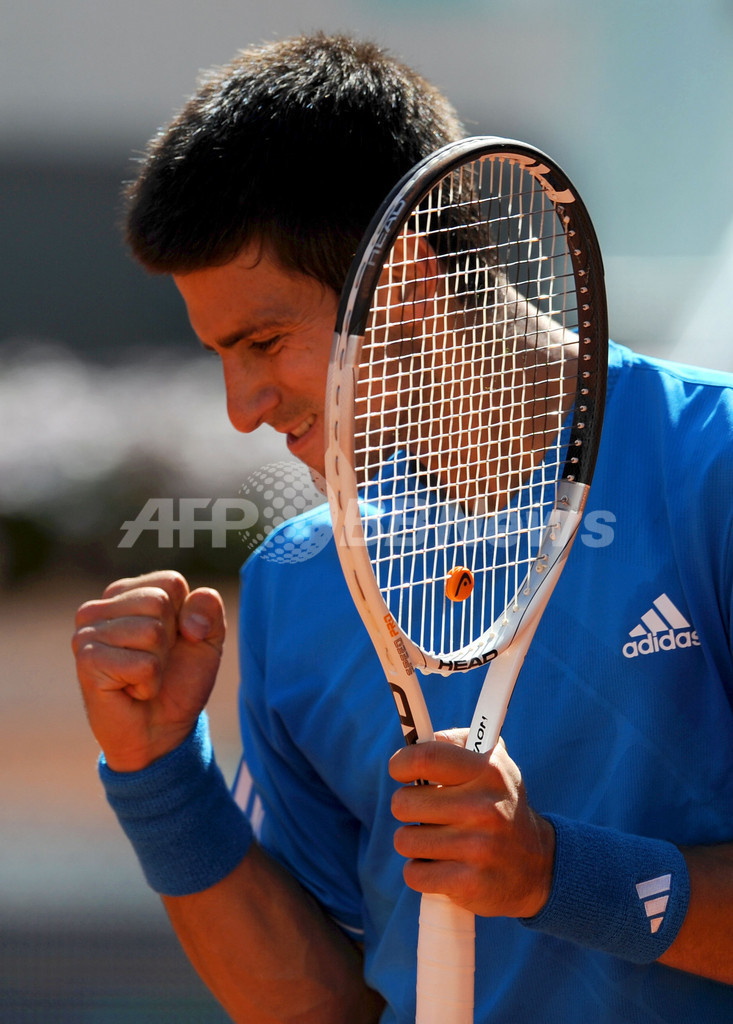 ムチュア・マドリレーニャ・マドリード・オープン(%%Mutua Madrilena Masters Madrid Open 2009%%)男子シングルス準決勝。大会第1シードのラファエル・ナダル(%%Rafael Nadal%%、スペイン)は、大会第3シードのノバク・ジョコビッチ(%%Novak Djokovic%%、セルビア)と対戦。ナダルは3-6、7-6、7-6でジョコビッチに勝利し、決勝進出を決めた。写真はポイントを奪い歓喜するジョコビッチ。(2009年5月16日撮影)(c)AFP/JAVIER SORIANO