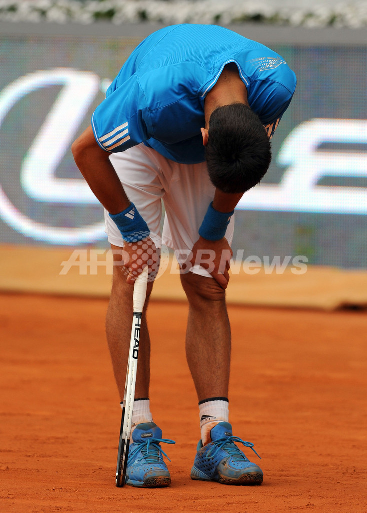 ムチュア・マドリレーニャ・マドリード・オープン(%%Mutua Madrilena Masters Madrid Open 2009%%)男子シングルス準決勝。大会第1シードのラファエル・ナダル(%%Rafael Nadal%%、スペイン)は、大会第3シードのノバク・ジョコビッチ(%%Novak Djokovic%%、セルビア)と対戦。ナダルは3-6、7-6、7-6でジョコビッチに勝利し、決勝進出を決めた。写真は落胆した様子を見せるジョコビッチ。(2009年5月16日撮影)(c)AFP/JAVIER SORIANO