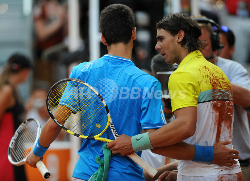 ムチュア・マドリレーニャ・マドリード・オープン(%%Mutua Madrilena Masters Madrid Open 2009%%)男子シングルス準決勝。大会第1シードのラファエル・ナダル(%%Rafael Nadal%%、スペイン)は、大会第3シードのノバク・ジョコビッチ(%%Novak Djokovic%%、セルビア)と対戦。ナダルは3-6、7-6、7-6でジョコビッチに勝利し、決勝進出を決めた。写真は試合後に健闘をたたえ合うジョコビッチ(左)とナダル。(2009年5月16日撮影)(c)AFP/JAVIER SORIANO