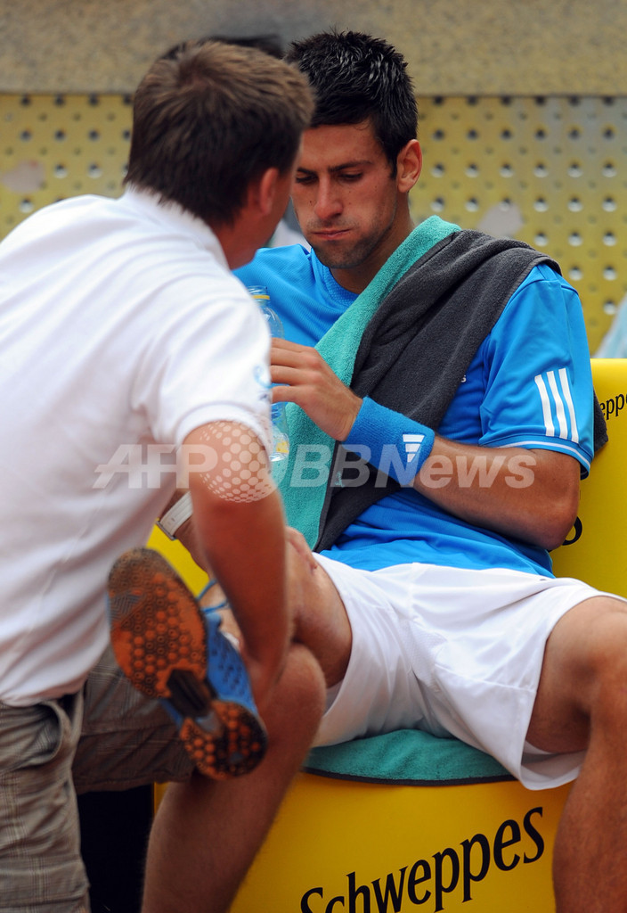 ムチュア・マドリレーニャ・マドリード・オープン(%%Mutua Madrilena Masters Madrid Open 2009%%)男子シングルス準決勝。大会第1シードのラファエル・ナダル(%%Rafael Nadal%%、スペイン)は、大会第3シードのノバク・ジョコビッチ(%%Novak Djokovic%%、セルビア)と対戦。ナダルは3-6、7-6、7-6でジョコビッチに勝利し、決勝進出を決めた。写真はマッサージを受けるジョコビッチ。(2009年5月16日撮影)(c)AFP/JAVIER SORIANO
