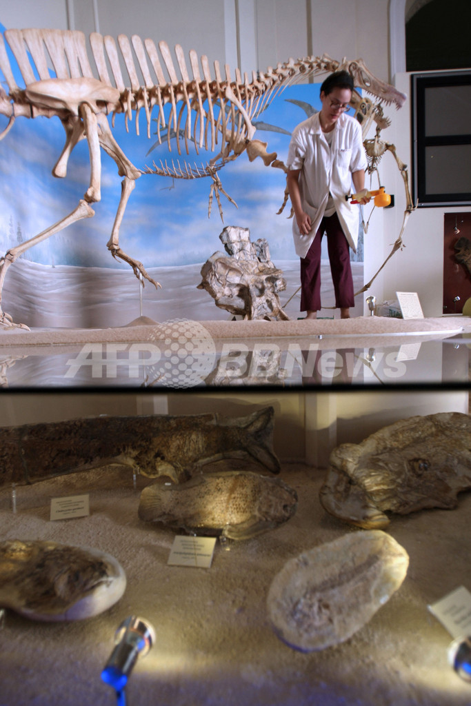 ニュース 環境・科学 約1億1000万年前の恐竜に思いをはせる 2009年5月17日 19:05 発信地:リオデジャネイロ/ブラジル [ 中南米 ブラジル ] このニュースをシェア ‹ › ❮ 7/12 ❯ 1991年にブラジル北東部セアラ(Ceara)州のアラリペ(Araripe)周辺で発掘された肉食恐竜、学名アンガトゥラマ・リマイ(Angaturama limai) の化石が15日から、同国の首都リオデジャネイロ(Rio de Janeiro)にある国立歴史博物館で公開されている。写真は準備される展示の一部。この肉食竜は約1億1000万年前に生息し、高さ3メートル、体長7メートルにも成長したと推測される(2009年5月14日撮影)。(c)AFP/VANDERLEI ALMEIDA 画像作成中 ! 【5月17日 AFP】(一部訂正)1991年にブラジル北東部セアラ(Ceara)州のアラリペ(Araripe)周辺で発掘された肉食恐竜、学名アンガトゥラマ・リマイ(Angaturama limai) の化石が15日から、同国の首都リオデジャネイロ(Rio de Janeiro)にある国立歴史博物館で公開されている。(c)AFP 環境・科学 一覧へ> メディア・報道関係・法人の方向け 写真・動画 購入のお問合せ>
