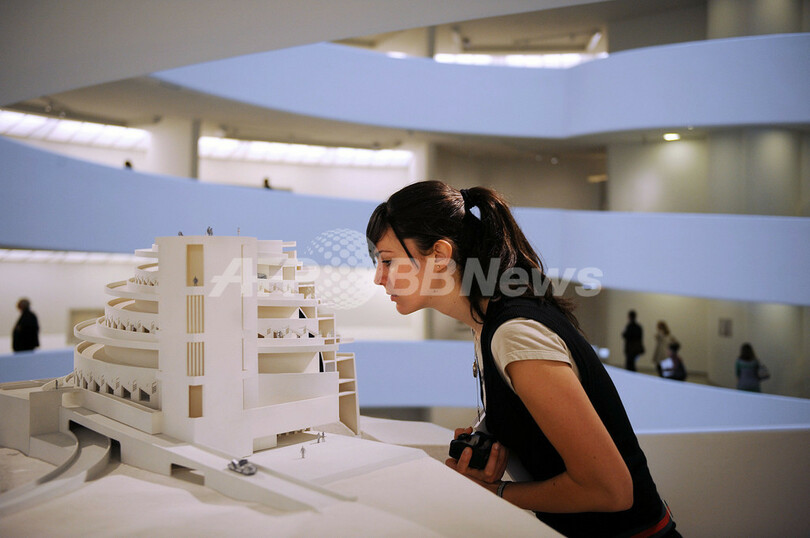 米ニューヨークのグッゲンハイム美術館(Guggenheim Museum)が開館50年記念展覧会として、同館の設計も手がけた建築家フランク・ロイド(Frank Lloyd)の回顧展「Frank Lloyd Wright: From Within Outward」を開催している。写真はメリーランド(Maryland)州シュガーローフ(Sugarloaf Mountain)への建設を想定し、実際には施工されなかった1924-25年の設計作品「Gordon Strong Automobile Objective and Planetarium」の模型(2009年5月14日撮影)。(c)AFP/Stan Honda