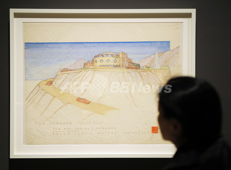 米ニューヨークのグッゲンハイム美術館(Guggenheim Museum)が開館50年記念展覧会として、同館の設計も手がけた建築家フランク・ロイド(Frank Lloyd)の回顧展「Frank Lloyd Wright: From Within Outward」を開催している。写真は1959年にアリゾナ(Arizona)州パラダイス・バレー(Paradise Valley)への建築を想定し、案だけに終わった「Helem Donahoe House」の完成予想スケッチ(2009年5月14日撮影)。(c)AFP/Stan Honda