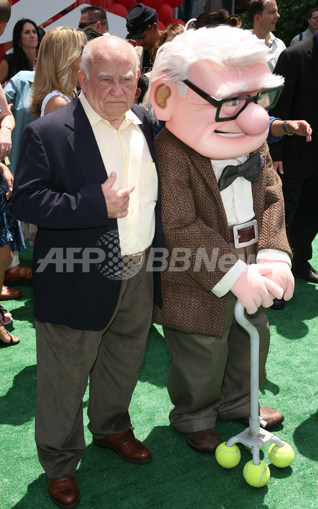 ピクサー(Pixar)の新作アニメ『カールじいさんの空飛ぶ家(Up)』のプレミア上映会が16日、米カリフォルニア州(California)ロサンゼルス(Los Angeles)のエル・キャピタン(El Capitan)劇場で開催され、主要キャラクターたちが集合した。写真は、主人公のカールとその声を担当した俳優エドワード・アズナー(Edward Asner、2009年5月16日撮影)。(c)AFP/VALERIE MACON