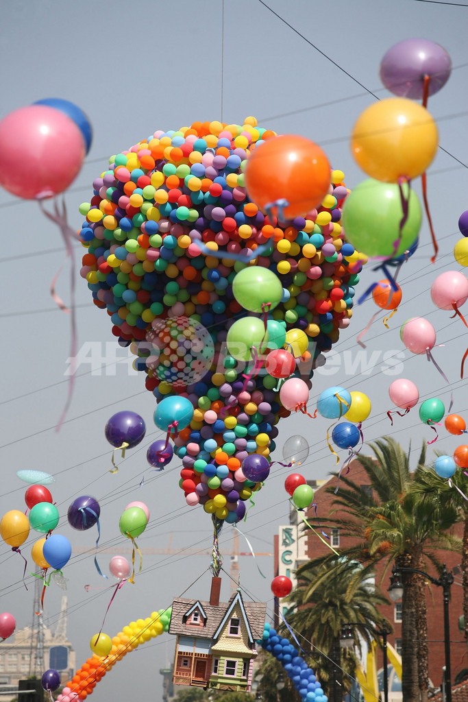 ピクサー(Pixar)の新作アニメ『カールじいさんの空飛ぶ家(Up)』のプレミア上映会が16日、米カリフォルニア州(California)ロサンゼルス(Los Angeles)のエル・キャピタン(El Capitan)劇場で開催され、主要キャラクターたちが集合した。写真は、映画になぞらえ風船で飛んでいく家(2009年5月16日撮影)。(c)AFP/VALERIE MACON
