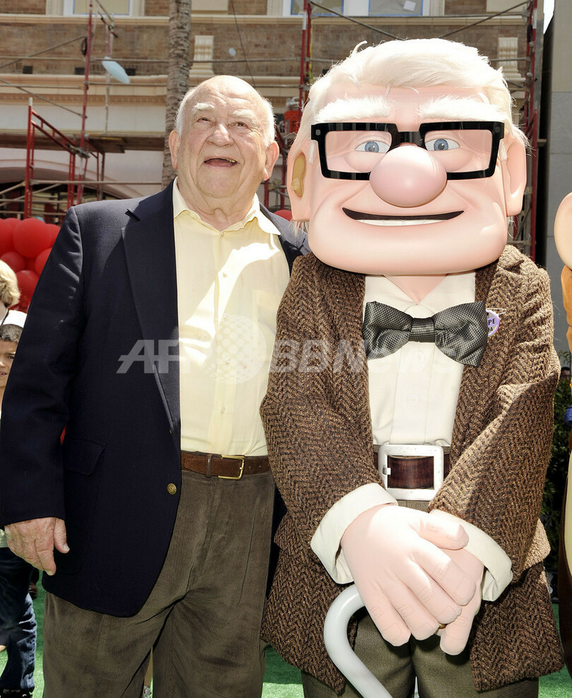 ピクサー(Pixar)の新作アニメ『カールじいさんの空飛ぶ家(Up)』のプレミア上映会が16日、米カリフォルニア州(California)ロサンゼルス(Los Angeles)のエル・キャピタン(El Capitan)劇場で開催され、主要キャラクターたちが集合した。写真は、主人公のカールとその声を担当した俳優エドワード・アズナー(Edward Asner、2009年5月16日撮影)。(c)AFP/Getty Images/Kevin Winter