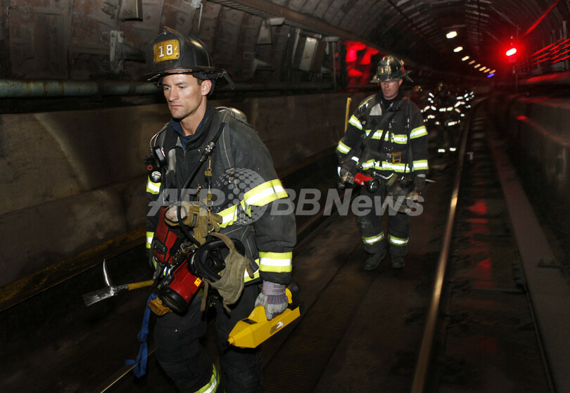 米ニューヨーク(New York)の世界貿易センター(World Trade Center)ビル跡地「グラウンド・ゼロ(Ground Zero)」周辺で17日、2001年9月11日の米同時多発攻撃事件以来、最大規模となる対テロ訓練が行われた。訓練は、隣接するニュージャージー(New Jersey)州とマンハッタン(Manhattan)とを結ぶ地下鉄パス(PATH)線のトンネル内で爆弾が爆発したとの想定で行われた。写真は、対テロ訓練で地下鉄内のトンネルを通り、被害者の救出に向かうニューヨーク市消防局(New York City Fire Department)の消防士(2009年5月17日撮影)。(c)AFP/Seth WENIG