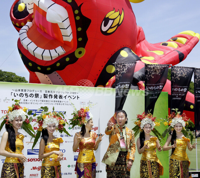 【5月18日 AFP】ファッションデザイナーの山本寛斎(Kansai Yamamoto)さんがプロデュースする、日本・インドネシア国交樹立50周年関連イベント「Festival of Life ~いのちの祭~ in INDONESIA」の制作発表会見が18日、都内で開催された。インドネシアの伝統衣装に身を包んだ女優菊川怜(Rei Kikukawa)さんらも出席し、会見に花を添えた。会場には山本さん監督・総指揮の前回のイベントで使われた全長40メートルの巨大なバルーンも登場。今回のショーでは竜とトラの形をしたバルーンが用意されるという。イベントは23日にバリ(Bali)島で開催される。(c)AFP