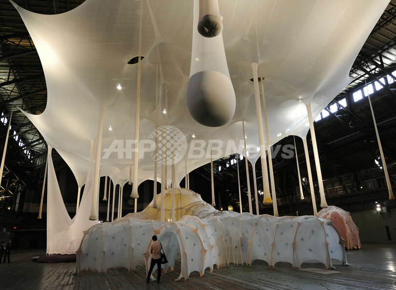写真は、ブラジルの前衛芸術家、エルネスト・ネト(Ernesto Neto)氏の巨大なインスタレーション作品「Anthropodino」の一部。面積約5110平方メートル、高さ約24メートルにも達する同作品は現在、米ニューヨーク(New York)のパークアベニュー・アーモリー(Park Avenue Armory)で6月14日まで公開されている(2009年5月15日撮影)。(c)AFP/TIMOTHY A. CLARY