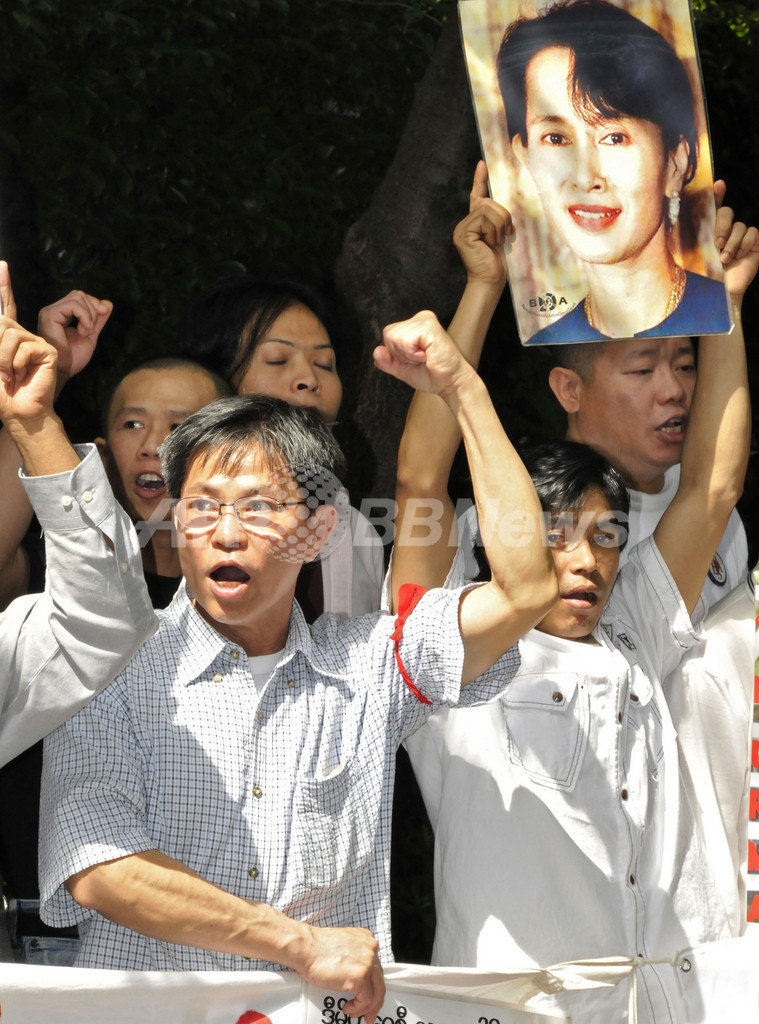 【5月18日 AFP】ミャンマーの軍事政権に、自宅軟禁の条件に違反したとして起訴された同国の民主化指導者アウン・サン・スー・チー(Aung San Suu Kyi)さんの審理が開始された18日、都内のミャンマー大使館前で在日ミャンマー人らが抗議行動を行った。