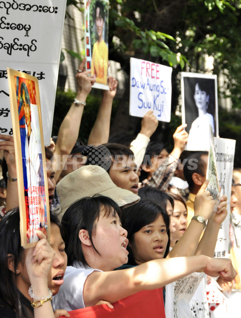 【5月18日 AFP】ミャンマーの軍事政権に、自宅軟禁の条件に違反したとして起訴された同国の民主化指導者アウン・サン・スー・チー(Aung San Suu Kyi)さんの審理が開始された18日、都内のミャンマー大使館前で在日ミャンマー人らが抗議行動を行った。