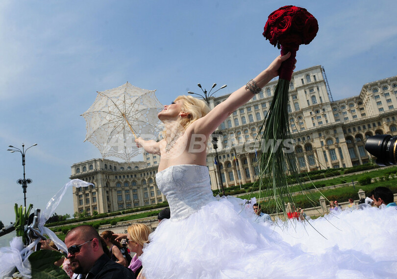 【5月19日 AFP】ルーマニアの首都ブカレスト(Bucharest)で17日、ブライド・パレードが行われた。これは、結婚式のカメラマンとウエディングドレスのデザイナーが企画し、結婚式は人生で最も華やかなイベントだと呼びかけたもの。ウエディングドレスを着た女性約100人が参加した。(c)AFP