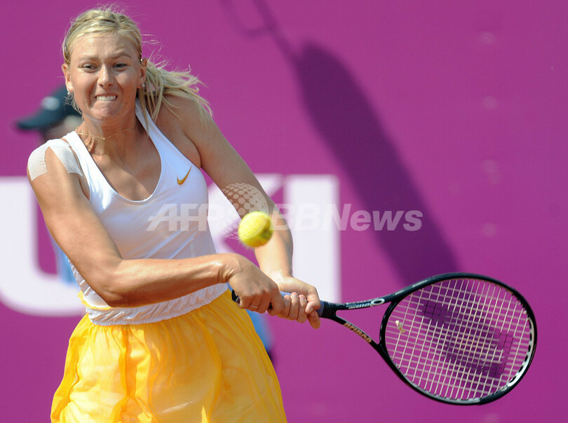 女子テニス、ワルシャワ・オープン(%%Warsaw Open 2009%%)シングルス準々決勝。ロシアのマリア・シャラポワ(%%Maria Sharapova%%)は、大会第8シードのアロナ・ボンダレンコ(%%Alona Bondarenko%%、ウクライナ)と対戦。シャラポワは2-6、2-6で敗れた。写真はリターンショットを放つマリア・シャラポワ。(2009年5月21日撮影)(c)AFP/ADAM NURKIEWICZ