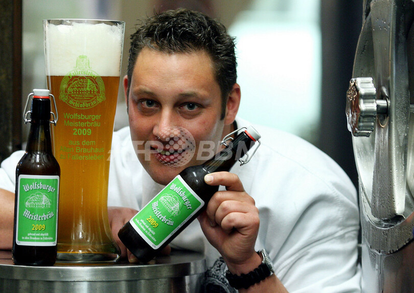 【5月23日 AFP】08-09ドイツ・ブンデスリーガ1部の最終節を23日に控え、首位に立っているVfLボルフスブルク(VfL Wolfsburg)の優勝を記念して製造された限定ビール「ボルフスブルク・チャンピオンビール(Wolfsburg Champion brew)」が22日、ドイツ北部の街ファラースレーベン(Fallersleben)で公開された。このビールは目前に迫るボルフスブルクの優勝を記念して、3000リットル製造された。(c)AFP