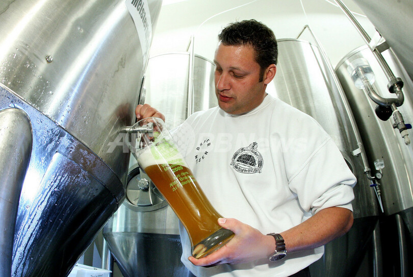 【5月23日 AFP】08-09ドイツ・ブンデスリーガ1部の最終節を23日に控え、首位に立っているVfLボルフスブルク(VfL Wolfsburg)の優勝を記念して製造された限定ビール「ボルフスブルク・チャンピオンビール(Wolfsburg Champion brew)」が22日、ドイツ北部の街ファラースレーベン(Fallersleben)で公開された。このビールは目前に迫るボルフスブルクの優勝を記念して、3000リットル製造された。(c)AFP
