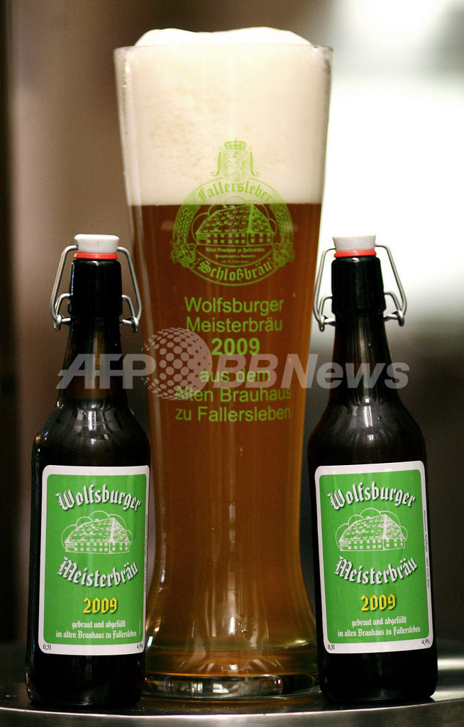 【5月23日 AFP】08-09ドイツ・ブンデスリーガ1部の最終節を23日に控え、首位に立っているVfLボルフスブルク(VfL Wolfsburg)の優勝を記念して製造された限定ビール「ボルフスブルク・チャンピオンビール(Wolfsburg Champion brew)」が22日、ドイツ北部の街ファラースレーベン(Fallersleben)で公開された。このビールは目前に迫るボルフスブルクの優勝を記念して、3000リットル製造された。(c)AFP