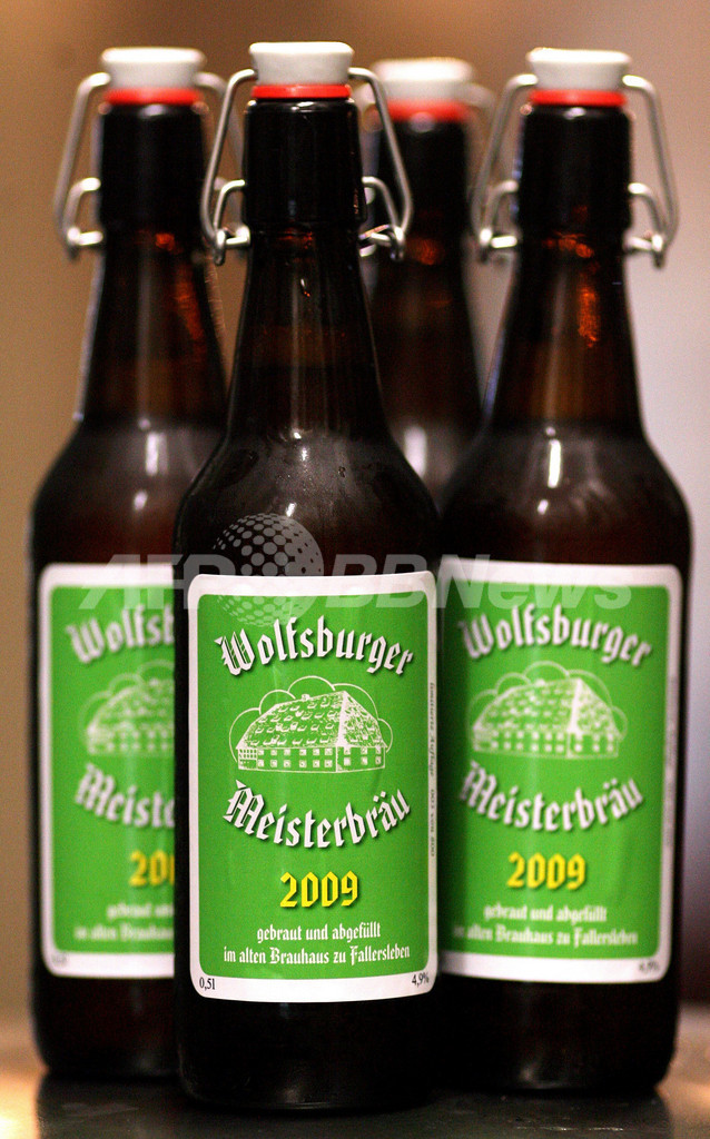【5月23日 AFP】08-09ドイツ・ブンデスリーガ1部の最終節を23日に控え、首位に立っているVfLボルフスブルク(VfL Wolfsburg)の優勝を記念して製造された限定ビール「ボルフスブルク・チャンピオンビール(Wolfsburg Champion brew)」が22日、ドイツ北部の街ファラースレーベン(Fallersleben)で公開された。このビールは目前に迫るボルフスブルクの優勝を記念して、3000リットル製造された。(c)AFP