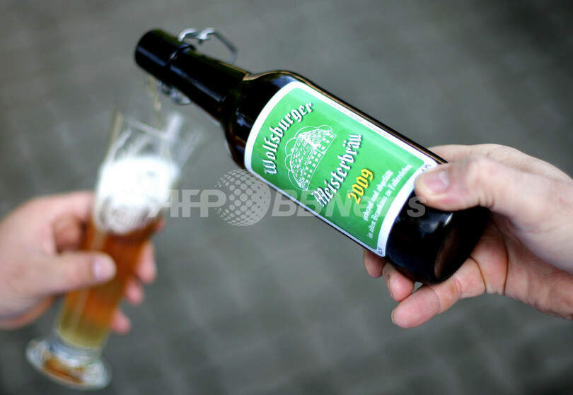 【5月23日 AFP】08-09ドイツ・ブンデスリーガ1部の最終節を23日に控え、首位に立っているVfLボルフスブルク(VfL Wolfsburg)の優勝を記念して製造された限定ビール「ボルフスブルク・チャンピオンビール(Wolfsburg Champion brew)」が22日、ドイツ北部の街ファラースレーベン(Fallersleben)で公開された。このビールは目前に迫るボルフスブルクの優勝を記念して、3000リットル製造された。(c)AFP