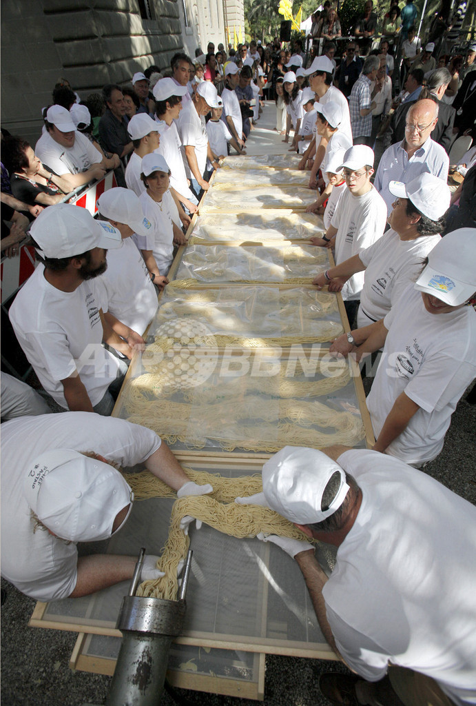 ニュース ライフ こぼれ話 世界一長いパスタ、本場イタリアの職人らが挑戦 2009年5月25日 15:15 発信地:Capezzano Pianore/イタリア [ ヨーロッパ イタリア ] このニュースをシェア ‹ › ❮ 1/6 ❯ イタリア中部のCapezzano Pianoreで23日、「世界一長いスパゲッティ」のギネス世界記録(Guinness World Records)に挑戦中の職人たち。350キロ以上の材料を使って長さ2.8キロを超えるスパゲッティを目指した。(2009年5月23日撮影)。(c)AFP/FABIO MUZZI 画像作成中 ! 【5月25日 AFP】イタリア中部のCapezzano Pianoreで23日、「世界一長いスパゲッティ」のギネス世界記録(Guinness World Records)に挑戦中の職人たち。350キロ以上の材料を使って長さ2.8キロを超えるスパゲッティを目指した。(c)AFP ライフ 一覧へ> メディア・報道関係・法人の方向け 写真・動画 購入のお問合せ>