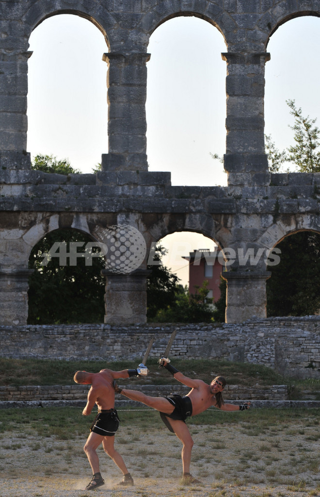 ニュース ライフ 夏の観光シーズン幕開けを告げる剣闘士の戦い、クロアチア 2009年5月25日 17:36 発信地:プーラ/クロアチア [ ヨーロッパ クロアチア ] このニュースをシェア ‹ › ❮ 8/8 ❯ クロアチア北部プーラ(Pula)にあるローマ時代の円形劇場(アリーナ)で23日、古代ローマの剣闘士に扮(ふん)した愛好家らが当時の戦いの様子を再現した。このイベントは毎年、プーラの夏の観光シーズンの幕を開ける伝統行事となっている。(c)AFP/HRVOJE POLAN 画像作成中 ! 【5月25日 AFP】クロアチア北部プーラ(Pula)にあるローマ時代の円形劇場(アリーナ)で23日、古代ローマの剣闘士に扮(ふん)した愛好家らが当時の戦いの様子を再現した。このイベントは毎年、プーラの夏の観光シーズンの幕を開ける伝統行事となっている。(c)AFP ライフ 一覧へ> メディア・報道関係・法人の方向け 写真・動画 購入のお問合せ>