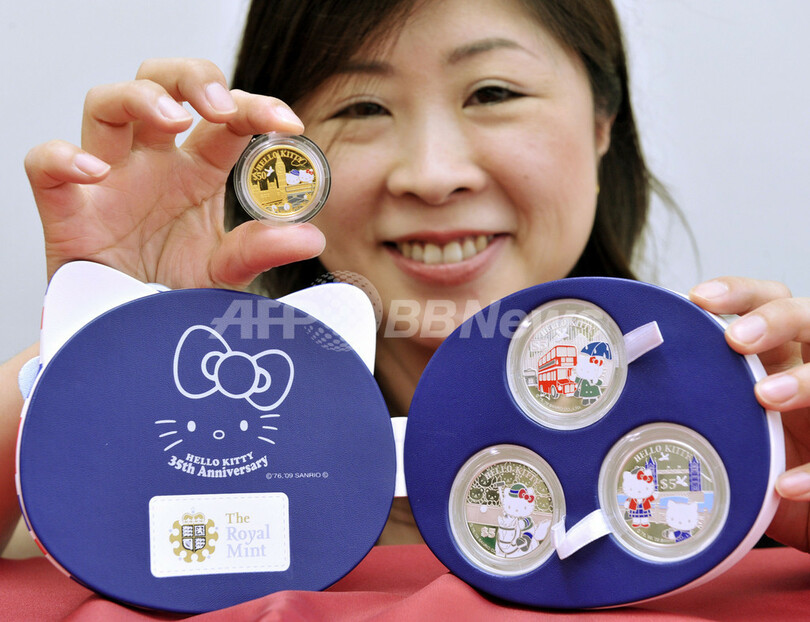【5月27日 AFP】コイン販売の泰星コイン(Taisei Coins)は26日、ハローキティ(Hello Kitty)の誕生35周年を記念した硬貨を発表した。英国王立造幣局(Royal Mint of Britain)が鋳造したもので、価格は50ドル金貨(15.61グラム)が12万6000円、10ドルカラー銀貨(155.517グラム)が3万9900円、5ドルカラー銀貨(28.28グラム)が1万1550円など。(c)AFP