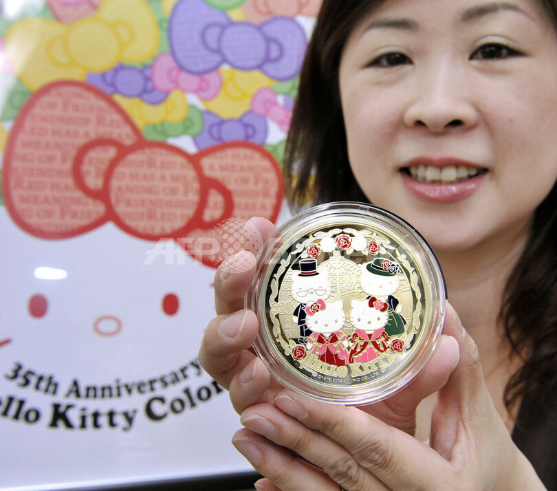 【5月27日 AFP】コイン販売の泰星コイン(Taisei Coins)は26日、ハローキティ(Hello Kitty)の誕生35周年を記念した硬貨を発表した。英国王立造幣局(Royal Mint of Britain)が鋳造したもので、価格は50ドル金貨(15.61グラム)が12万6000円、10ドルカラー銀貨(155.517グラム)が3万9900円、5ドルカラー銀貨(28.28グラム)が1万1550円など。(c)AFP