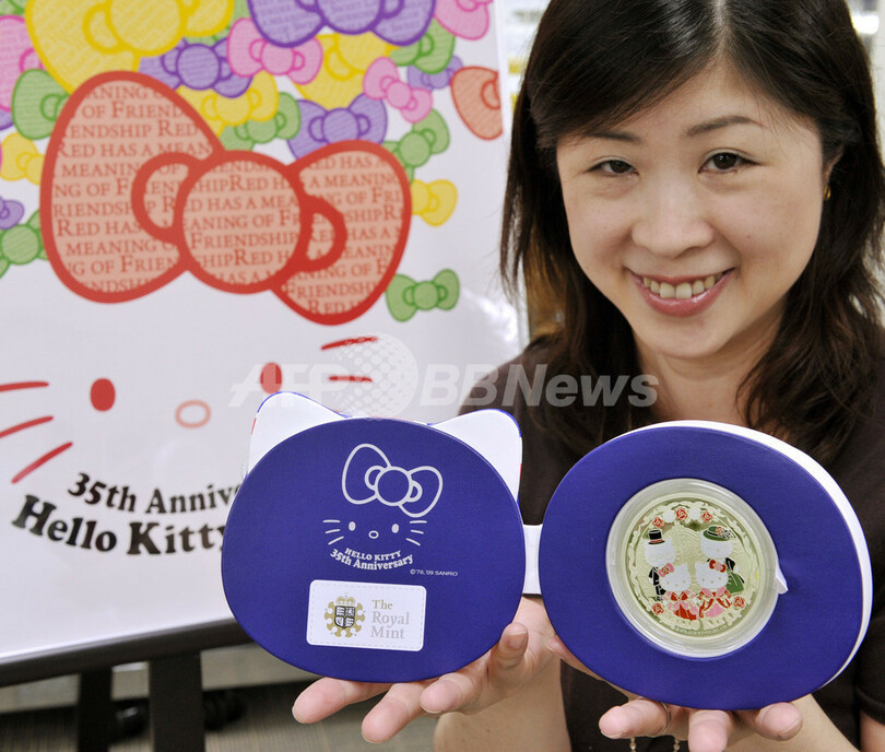 【5月27日 AFP】コイン販売の泰星コイン(Taisei Coins)は26日、ハローキティ(Hello Kitty)の誕生35周年を記念した硬貨を発表した。英国王立造幣局(Royal Mint of Britain)が鋳造したもので、価格は50ドル金貨(15.61グラム)が12万6000円、10ドルカラー銀貨(155.517グラム)が3万9900円、5ドルカラー銀貨(28.28グラム)が1万1550円など。(c)AFP