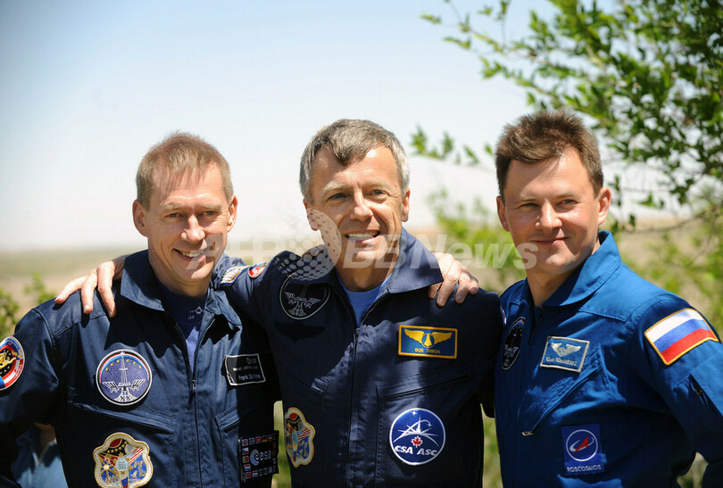 写真は、バイコヌール宇宙基地で撮影されたソユーズTMA-15に搭乗する(左から)フランク・ディベナ、ロバート・サースク、ロマン・ロマネンコの3飛行士(2009年5月25日撮影)。(c)AFP/DMITRY KOSTYUKOV