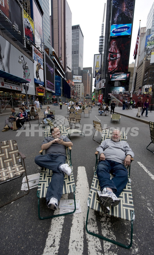 ニュース ライフ タイムズスクエアが歩行者天国に 2009年5月27日 14:46 発信地:ニューヨーク/米国 [ 北米 米国 ] このニュースをシェア ‹ › ❮ 1/21 ❯ ニューヨーク(New York)のタイムズスクエア(Times Square)周辺が、24日から歩行者天国になった。これは、交通渋滞や接触事故を減らすことを目的に、マイケル・ブルームバーグ(Michael Bloomberg)市長が推し進めた政策で、42丁目から47丁目までのブロードウェー(Broadway)と、35丁目から33丁目までの道路が、車両進入禁止となっている。写真は、歩行者天国となったタイムズスクエアに置かれたローンチェアでくつろぐ男性たち(2009年5月26日撮影)。(c)AFP/DON EMMERT 画像作成中 ! 【5月27日 AFP】ニューヨーク(New York)のタイムズスクエア(Times Square)周辺が、24日から歩行者天国になった。これは、交通渋滞や接触事故を減らすことを目的に、マイケル・ブルームバーグ(Michael Bloomberg)市長が推し進めた政策で、42丁目から47丁目までのブロードウェー(Broadway)と、35丁目から33丁目までの道路が、車両進入禁止となっている。(c)AFP ライフ 一覧へ> メディア・報道関係・法人の方向け 写真・動画 購入のお問合せ>