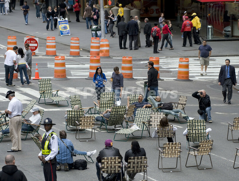 ニュース ライフ タイムズスクエアが歩行者天国に 2009年5月27日 14:46 発信地:ニューヨーク/米国 [ 北米 米国 ] このニュースをシェア ‹ › ❮ 6/21 ❯ ニューヨーク(New York)のタイムズスクエア(Times Square)周辺が、24日から歩行者天国になった。これは、交通渋滞や接触事故を減らすことを目的に、マイケル・ブルームバーグ(Michael Bloomberg)市長が推し進めた政策で、42丁目から47丁目までのブロードウェー(Broadway)と、35丁目から33丁目までの道路が、車両進入禁止となっている。写真は、歩行者天国となったタイムズスクエアに置かれたローンチェアでくつろぐ観光者たち(2009年5月26日撮影)。(c)AFP/DON EMMERT 画像作成中 ! 【5月27日 AFP】ニューヨーク(New York)のタイムズスクエア(Times Square)周辺が、24日から歩行者天国になった。これは、交通渋滞や接触事故を減らすことを目的に、マイケル・ブルームバーグ(Michael Bloomberg)市長が推し進めた政策で、42丁目から47丁目までのブロードウェー(Broadway)と、35丁目から33丁目までの道路が、車両進入禁止となっている。(c)AFP ライフ 一覧へ> メディア・報道関係・法人の方向け 写真・動画 購入のお問合せ>
